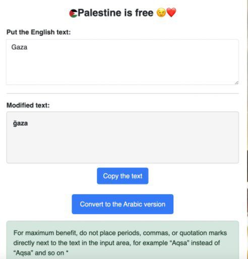 وفي سياق الإصرار على النّشر ، أنشأ محمد درويش، 31 عامًا، مؤسس شركة "Bydotpy"، وهي شركة بلوكتشين مقرها القاهرة، مصر، موقعًا إلكترونيًا يُسمى "Free Palestine.bydotpy" يُؤَتْمِتُ(جعل المهام تتمّ بشكل تلقائيّ وآليّ )العملية نفسها. على سبيل المثال، عند كتابة "غزة" في موقعه الإلكتروني، يتم تغييرها تلقائيًا إلى "غزة"، ويمكن للمستخدمين نسخها ولصقها في تطبيق التواصل الاجتماعي الذي يختارونه.
