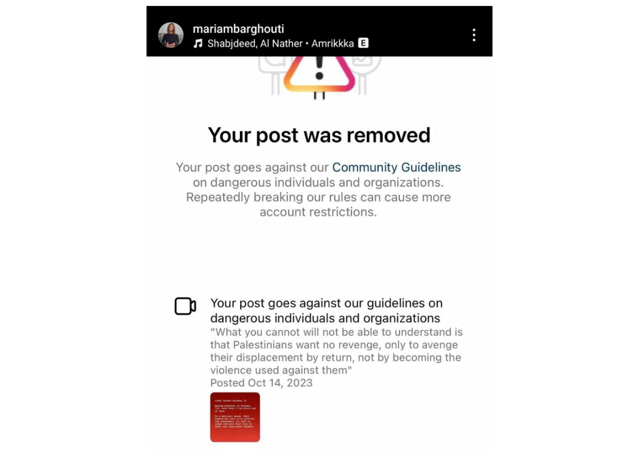 ووفقا لموقع الجزيرة:" نشرت الصحفية الفلسطينية مريم البرغوثي مقالاً جاء فيه "ما لا يُمكن فهمه هو أنّ الفلسطينيين لا يريدون الانتقام، بل يريدون فقط الانتقام لنزوحهم بالعودة، وليس بالانتقام من العنف المُستخدم ضدهم". حُذف المنشور لمخالفته سياسة ميتا لمكافحة التطرف، والمُسماة "الأفراد والمنظمات الخطرة". المصدر: لقطة شاشة للكاتبة من إنستغرام."